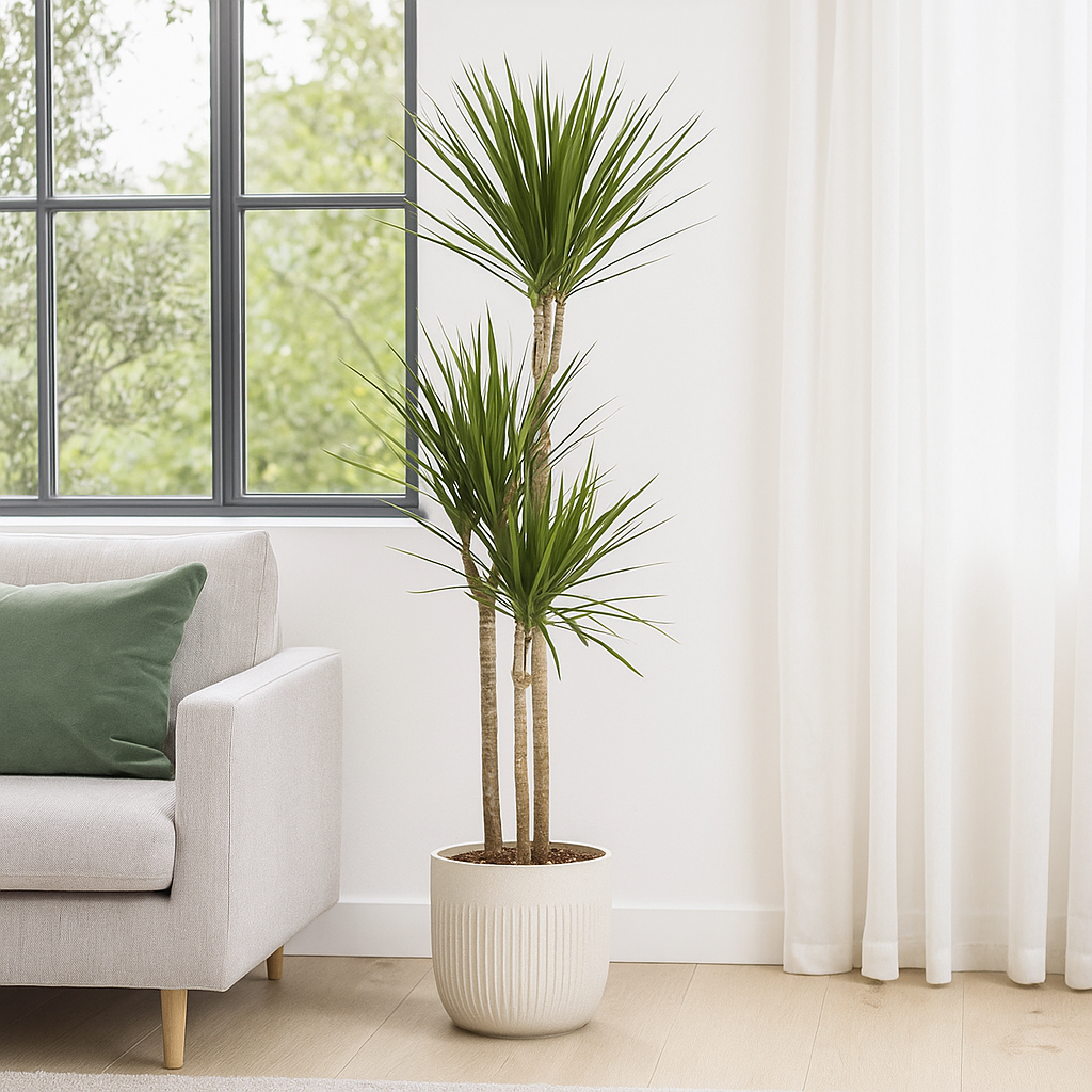 Voeg een vleugje tropische eenvoud toe aan je interieur met de Dracaena Marginata Green – een elegante, onderhoudsvriendelijke kamerplant van 110 tot 130 cm hoog met een tijdloos karakter. Deze variant van de populaire Dracaena Marginata kenmerkt zich door zijn smalle, donkergroene bladeren en slanke, opgaande groeiwijze. Het contrast tussen de stevige stam en het weelderige bladerdek zorgt voor een minimalistische, maar levendige uitstraling.