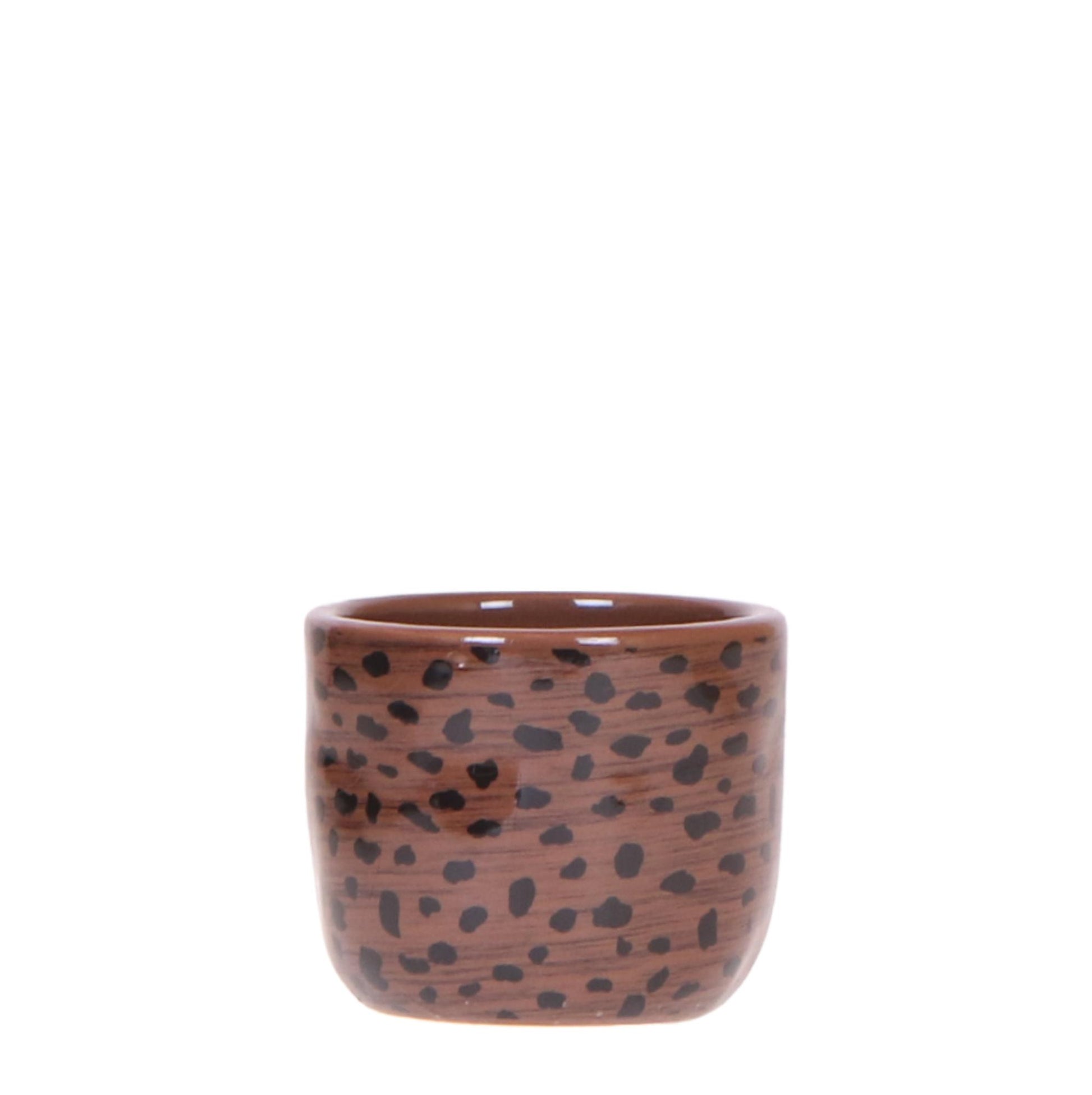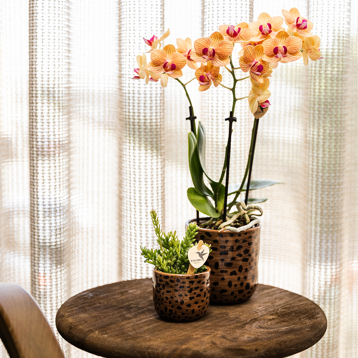 Durf te kiezen voor een opvallende look met de Leopard Pot! Deze unieke sierpot combineert een warme bruine basiskleur met een speelse, zwarte luipaardprint. Een echte eyecatcher voor elk interieur – perfect om jouw Kolibri Orchids of Greens een stoer en modieus podium te geven.