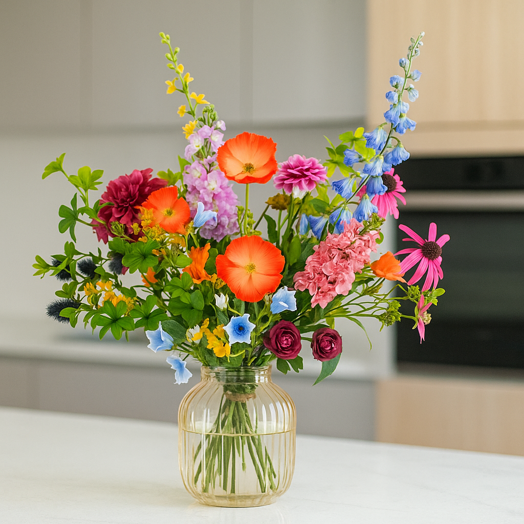 Gedurfd, energiek en onweerstaanbaar stijlvol – het Kunstbloemen Boeket XL - Electric Love van 90 cm is een echte eyecatcher. Dit extra grote boeket barst van kleur en contrast, met levendige tinten als fuchsia, rood, paars en koraal, gecombineerd in een krachtige en speelse compositie. De hoogwaardige zijden bloemen zijn met oog voor detail afgewerkt en brengen direct sfeer, karakter en een creatieve flair in elke ruimte. Perfect voor wie durft op te vallen – zonder gedoe met water of onderhoud. Altijd in bloei, altijd vol liefde.