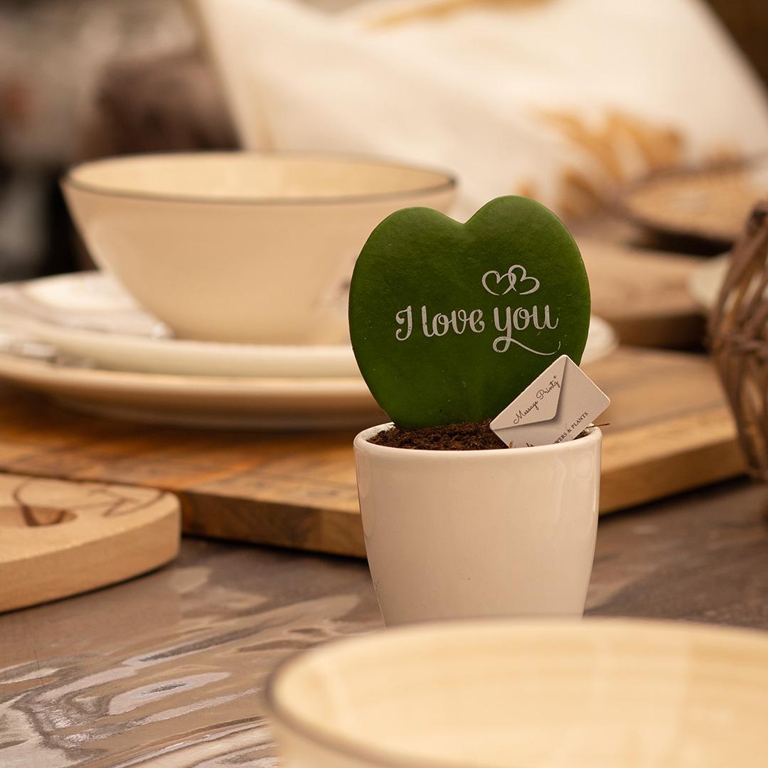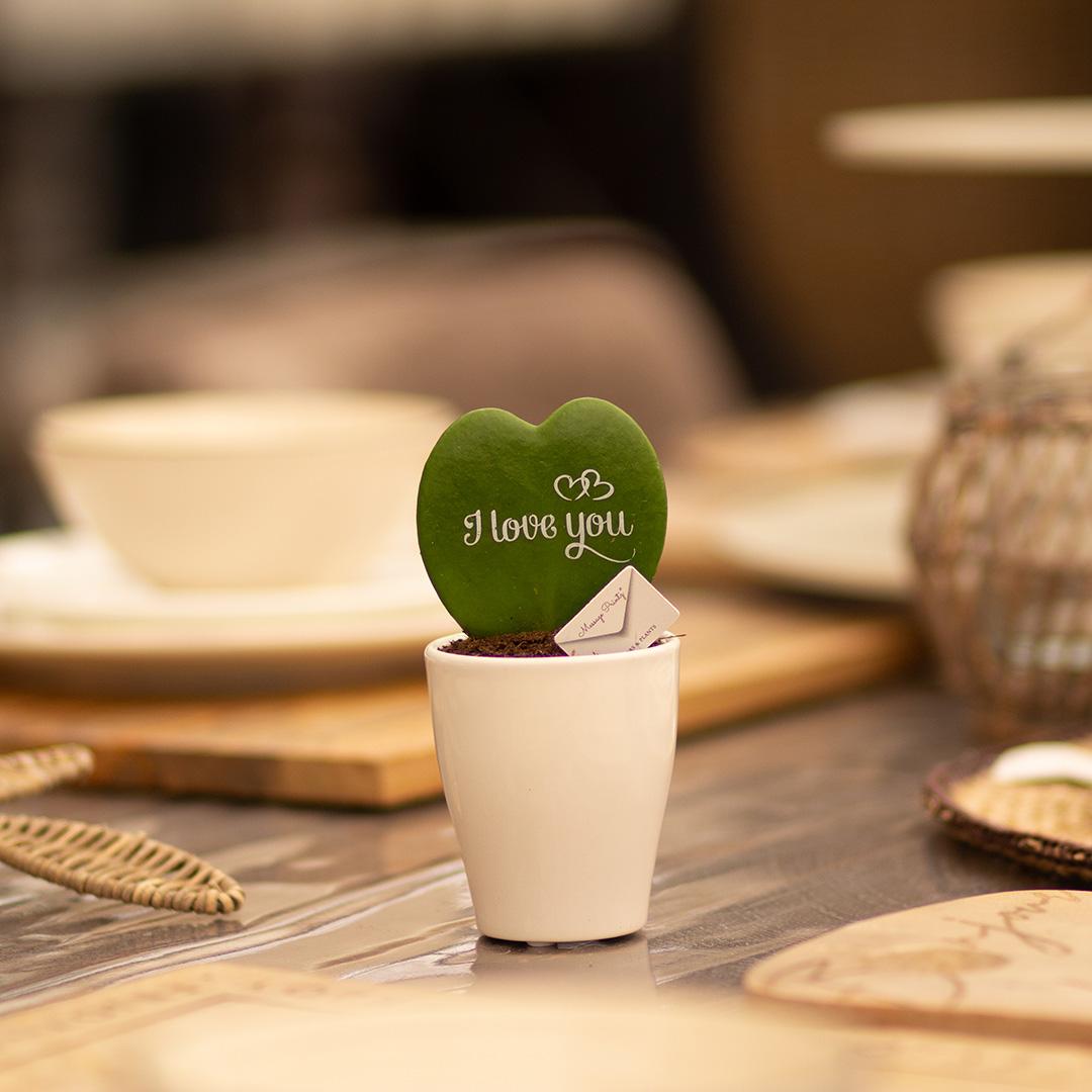 Laat je liefde spreken met de Message Printz® Hoya (Heartplant) | I love you – een schattig, groen gebaar met een hart van betekenis. Deze unieke Hoya Kerrii, ook wel bekend als de "heartplant", heeft een natuurlijke hartvorm en draagt de opdruk "I love you" op het blad. Een perfect en blijvend alternatief voor een traditioneel kaartje of bos bloemen.