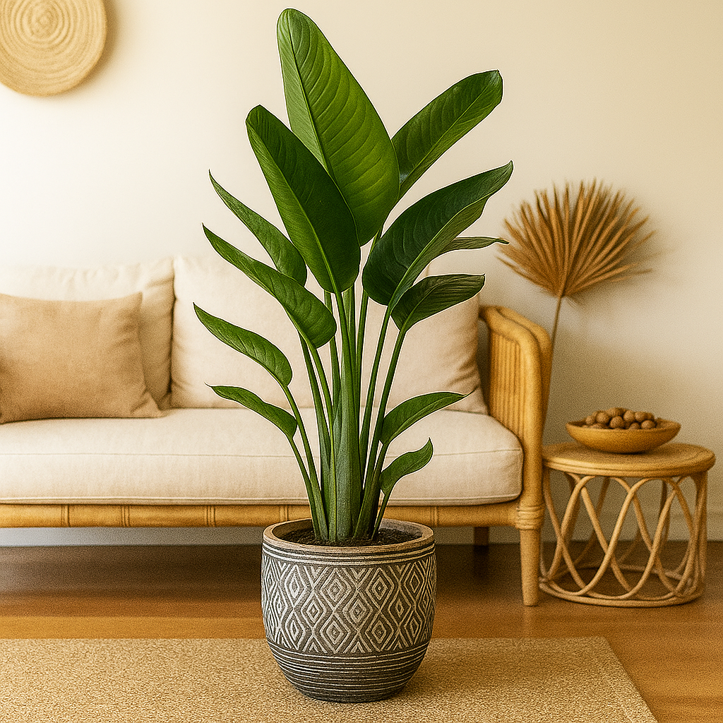 Voeg een vleugje tropische elegantie toe aan je interieur met de Strelitzia Nicolai – 90 cm hoog, in een pot van ⌀19 cm. Deze sierlijke kamerplant, ook wel bekend als de ‘Witte Paradijsvogelplant’, staat bekend om haar opgaande groei en grote, waaierachtige bladeren die een luxe, botanische sfeer creëren.