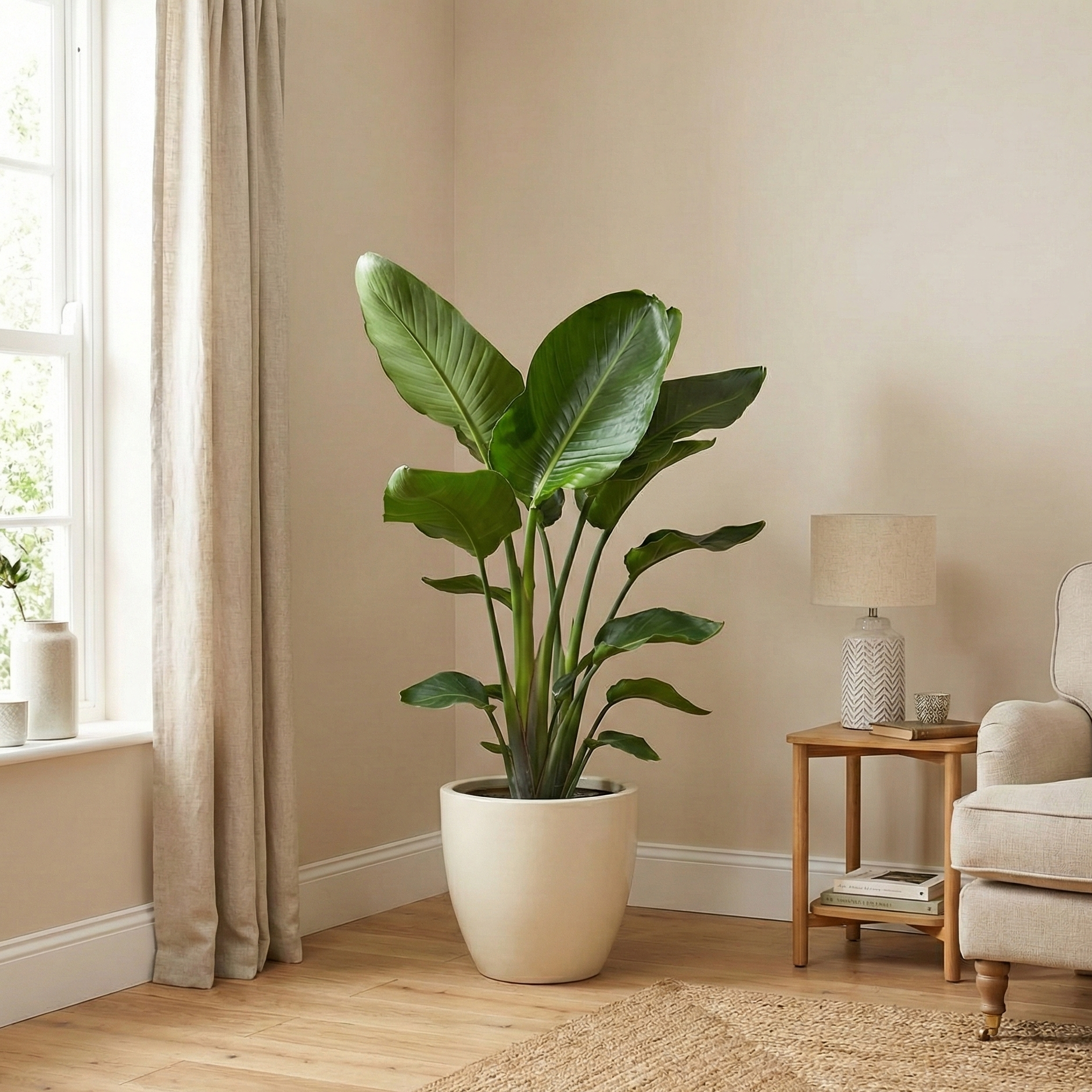 Breng een vleugje tropische elegantie in huis met de Strelitzia Nicolai – Paradijsvogelplant – Ø19 cm – ↕90 cm. Deze stijlvolle plant, met haar grote, frisgroene bladeren, zorgt voor een moderne en natuurlijke uitstraling in elke ruimte. Een perfecte keuze voor liefhebbers van robuuste, decoratieve kamerplanten.